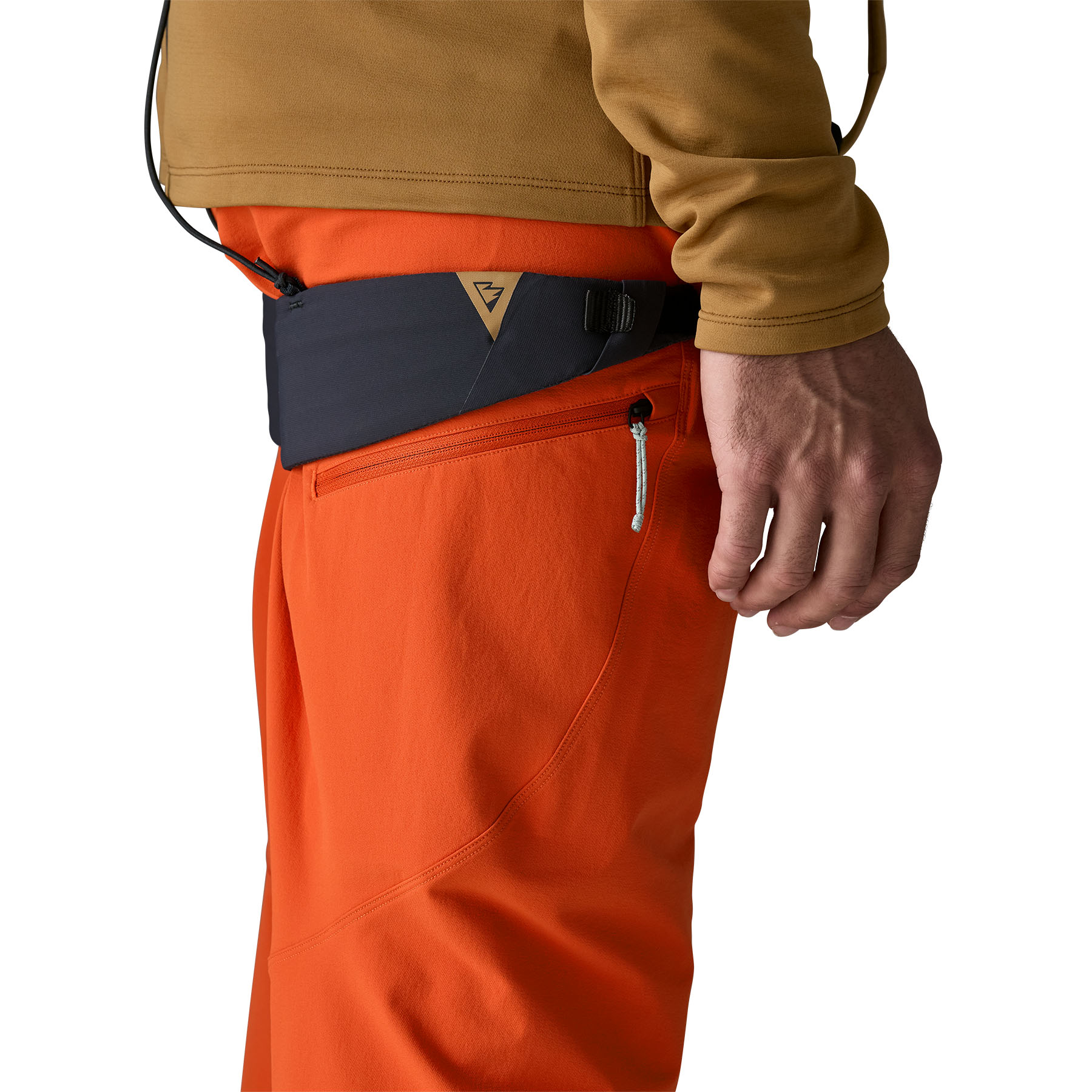 Two zippered thigh pockets stay clear of harness leg loops; one zippered back pocket keeps small items secure while on the move
